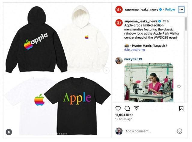 最常见的物品似乎是黑色或白色连帽衫,六色标志加上小写的 “apple” 字样,塞进了著名的苹果被咬的缺口中。